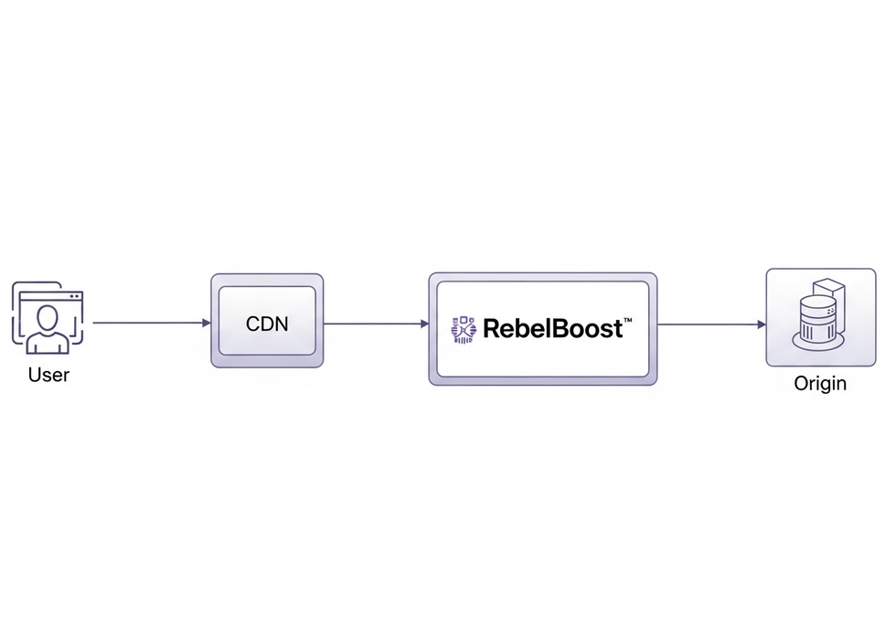 RebelBoost creates an intelligent optimization layer by sitting between your CDN and origin servers. No code changes needed. No migration required. No downtime during setup.