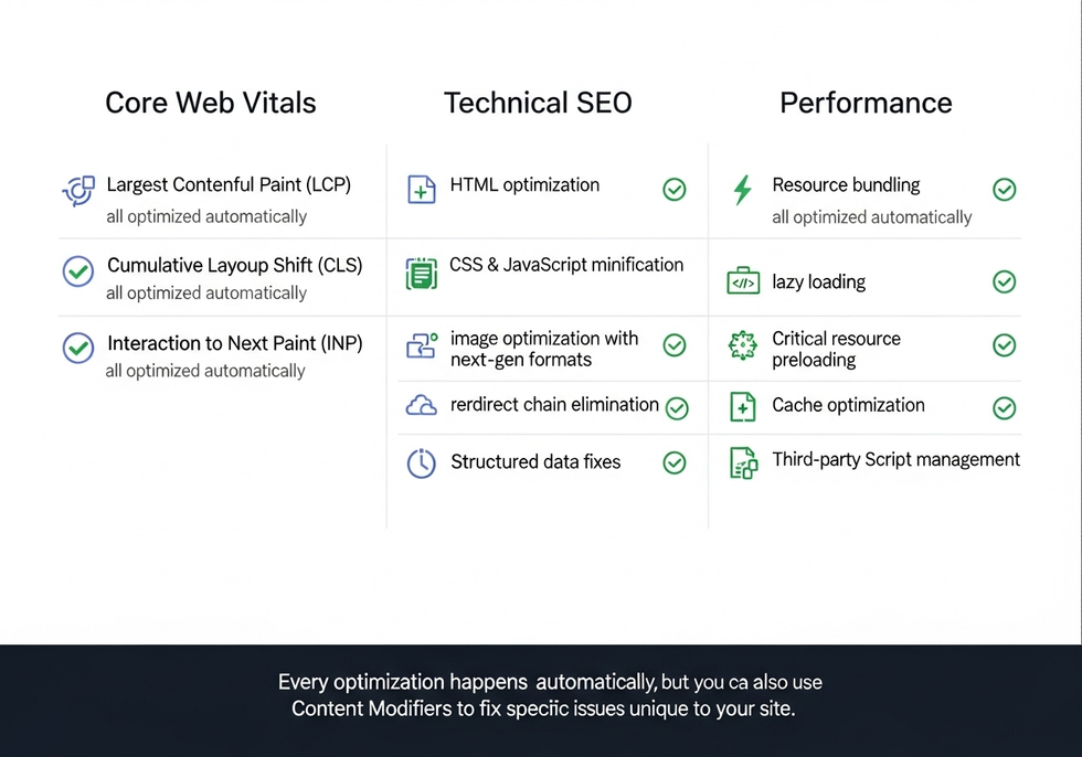 Core Web Vitals: Largest Contentful Paint (LCP), Cumulative Layout Shift (CLS with content modifiers), Interaction to Next Paint (INP) - all optimized automatically.