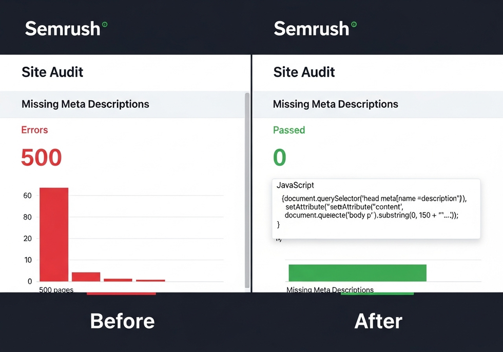 With RebelBoost Content Modifiers, you write a simple JavaScript rule to generate meta descriptions from your existing content. Deploy it instantly. The issue is fixed in minutes, and your next Semrush scan shows perfect scores. This isn't theoretical - it's what our users do every day.