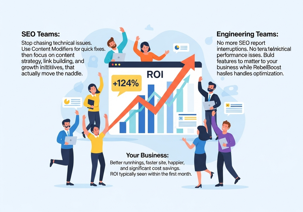 Engineering Teams: No more SEO report interruptions. No more technical debt from performance issues. Build features that matter to your business while RebelBoost handles optimization.