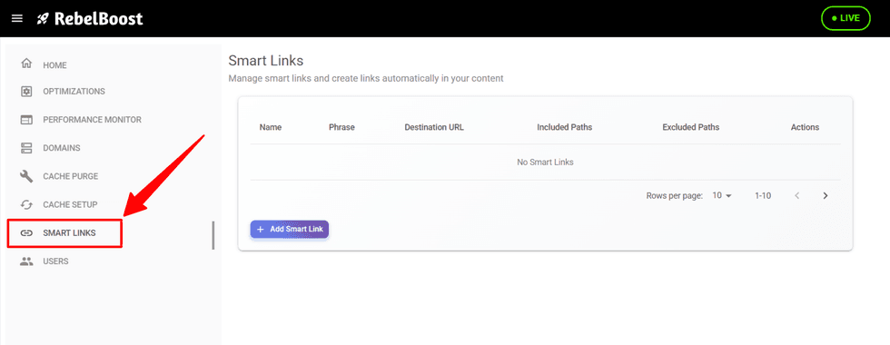 Once you’re logged into Rebelboost, navigate to the SmartLinks tab in the left sidebar of the dashboard.
